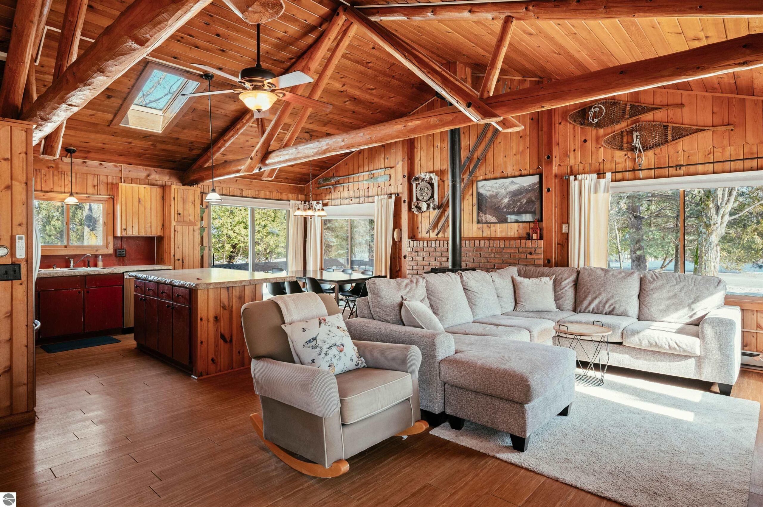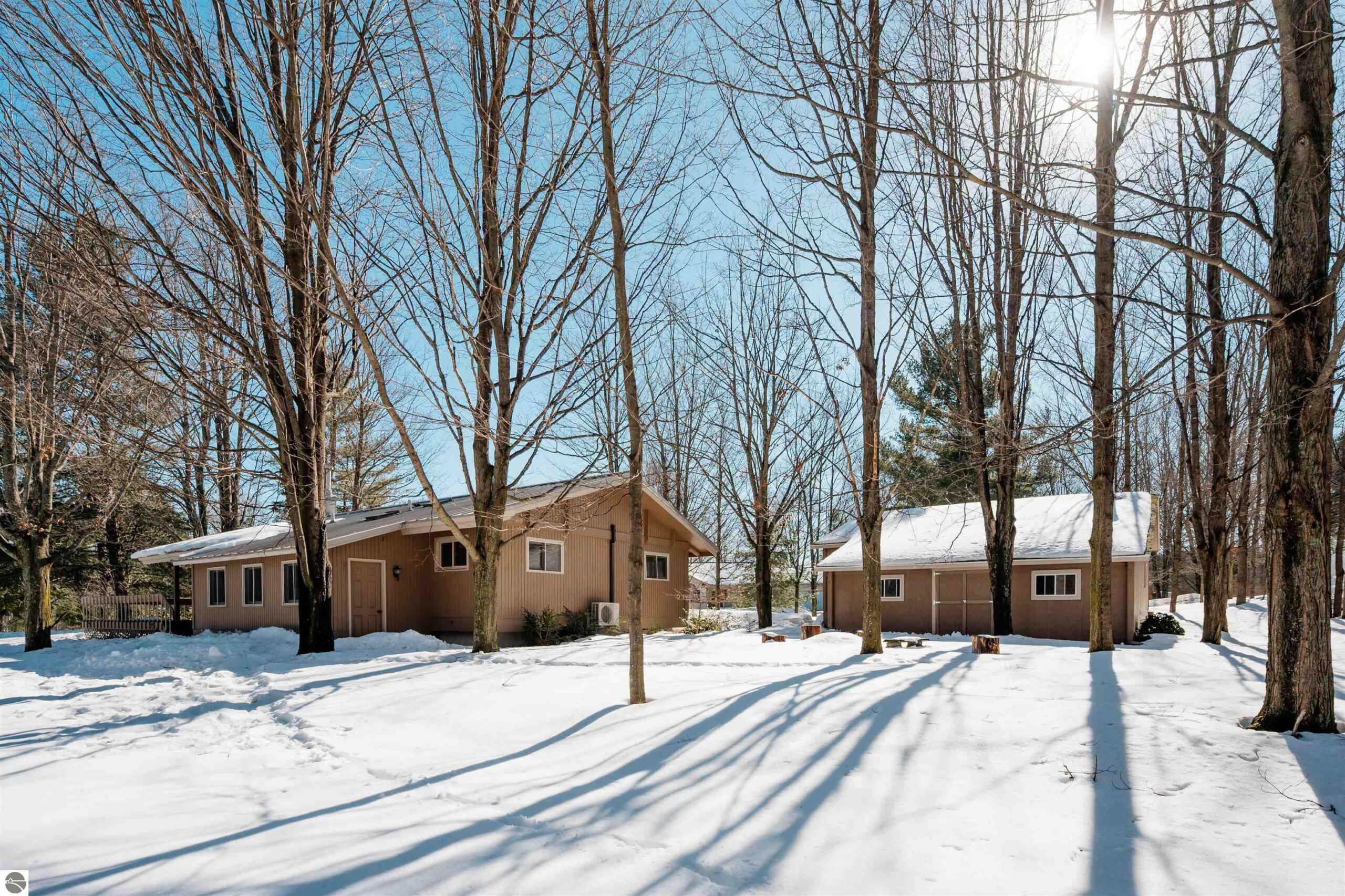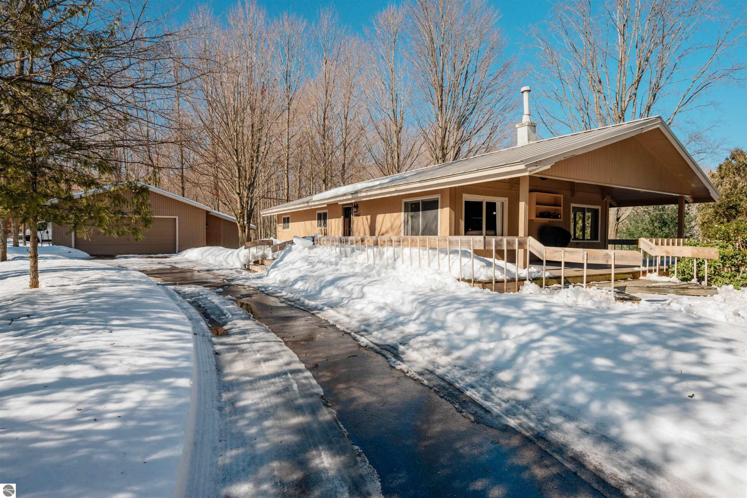You want the unapologetic, rustic cabin vibe, but you also refuse to have cold feet when you step out of the shower. Welcome home! The interior is defined by solid post-and-beam construction, where soaring wood ceilings and a river stone entry immediately set the tone. Designed for year-round comfort, the home features mini-split heating and air conditioning, heated bathroom floors (because suffering is completely unnecessary), and an inviting gas fireplace, giving you all the Up North ambiance with zero wood-chopping required. Outside, an expansive wraparound deck overlooks the private, wooded backyard and a dedicated bonfire area. The home is equipped with a durable metal roof and a detached, oversized two-car garage, offering the essential utility and storage space needed for Northern Michigan living. The location is fantastic: just a short commute to town, right around the corner from Timberlee for winter snow tubing, association tennis courts, and offering the ultimate amenity, exclusive association beach access to South Lake Leelanau. Enjoy approximately 800 feet of shared sandy frontage, a clubhouse, and kayak/SUP storage. A solid build in a superior location, ready for its next chapter!