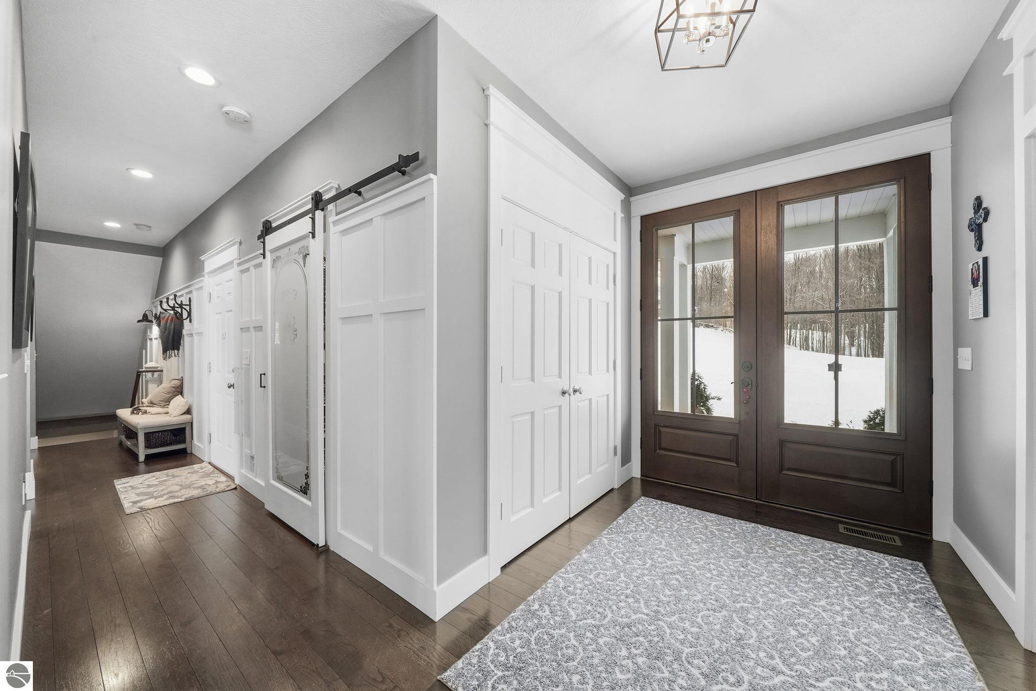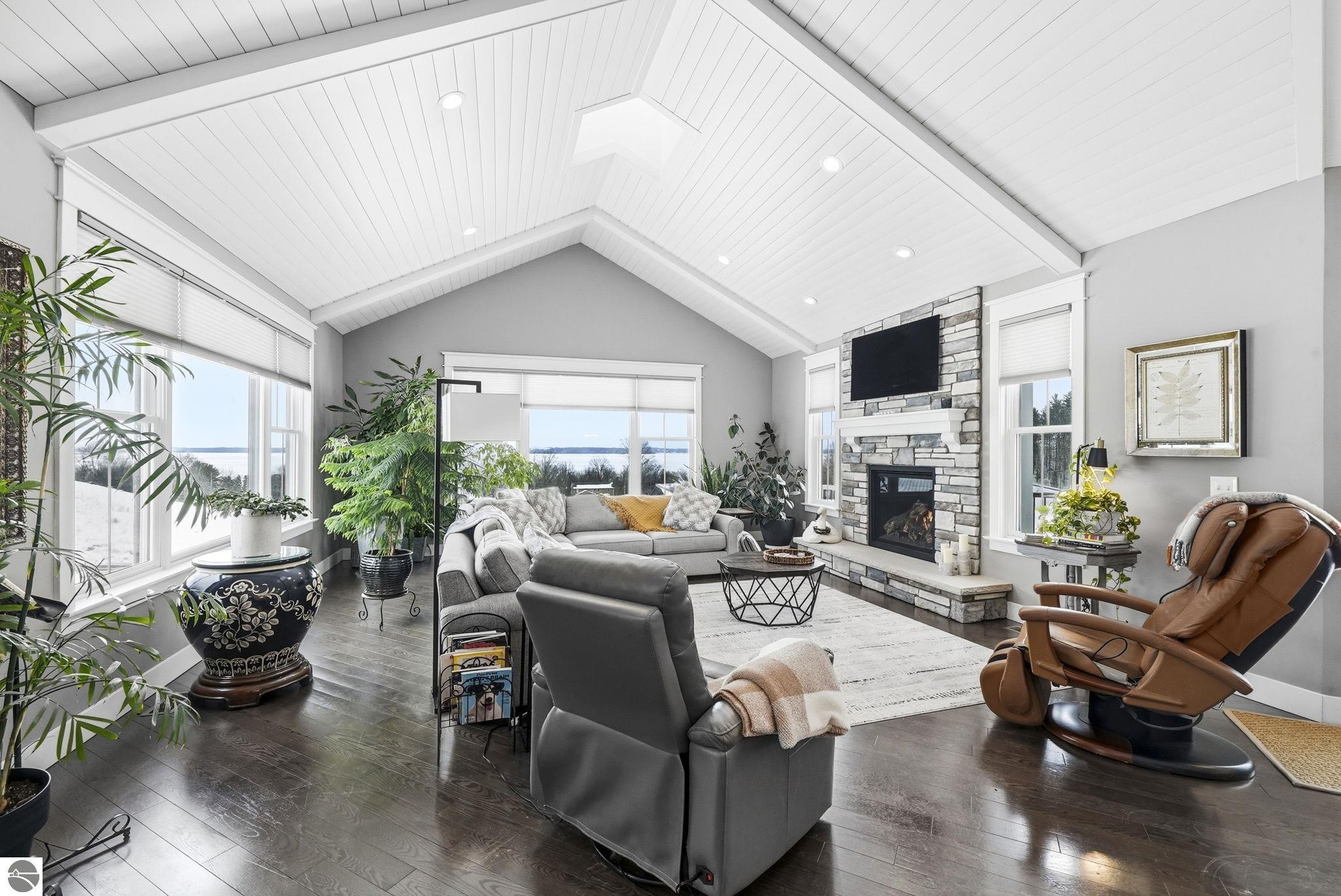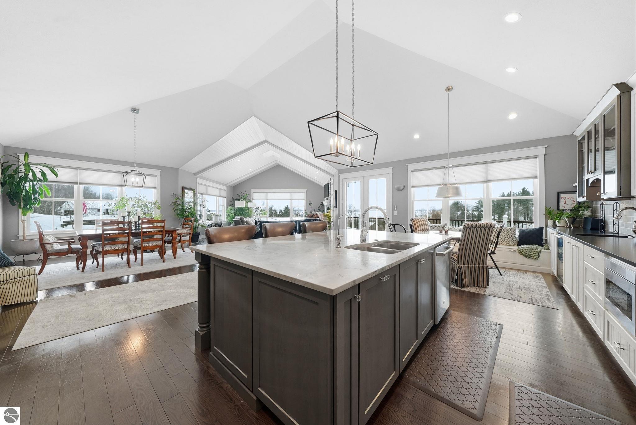 Enjoy peaceful living in beautiful Leelanau County with this thoughtfully designed home overlooking West Bay. Large windows throughout the home bring in tons of natural light and capture the stunning water views, while hardwood floors and granite countertops add quality and style. The main living area offers an open, comfortable layout perfect for everyday living or entertaining. A charming cupola adds character and enhances the bright, airy feel of the home. The finished lower level includes a second living area and full kitchen, making it ideal for guests, extended family, or multi-generational living. You’ll also appreciate the dog wash station, two laundry rooms (one on each level), art room (accessory room) and plenty of storage throughout. Upstairs, a versatile bonus room provides the perfect space for a home office, gym, studio, or media room. Don't miss the beach access on the other side of M22! If you’re looking for a Leelanau County home with West Bay views, flexible living space, and Northern Michigan charm, this property offers a rare opportunity in an incredible setting.