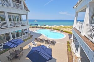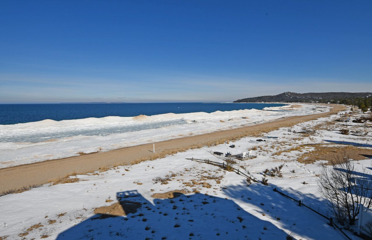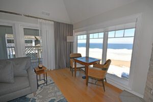 Spectacular views of Sleeping Bear Point, the Manitou Islands, the boat launch, and pool from this upper level, fully remodeled condominium!